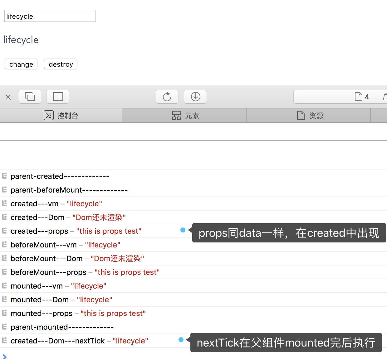 上面的代码其实是子组件,只是我完全独立的看待它本身的生命周期,现在在父组件中,添加一些钩子函数以及props,代码如下: