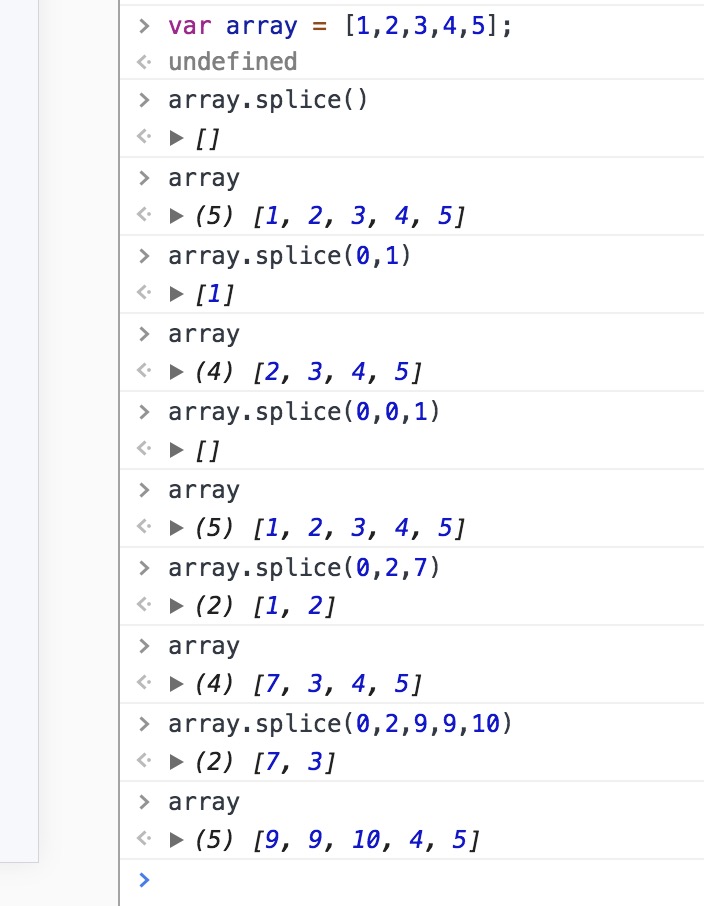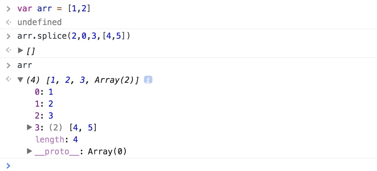 splice() => 从指定索引开始删除某些项再插入某些项(参数直接做为数组的项,即便参数是数组,也不会像concat那样数组项要分解追加进去),参数为空原数组不变,插入项可以是多项,返回被删除项组成的数组,没删除返回空数组,影响的就是原数组