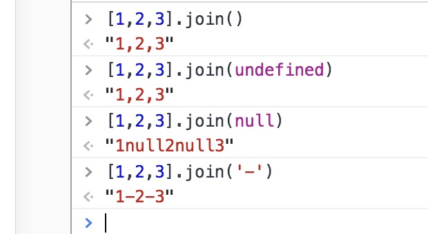以上返回的是以逗号分隔的字符串,join()可以自定义分隔符,不传递参数或者传undefined则都默认为逗号分隔,注意传递null会以null分隔,传递NaN会以NaN分隔,不影响原数组