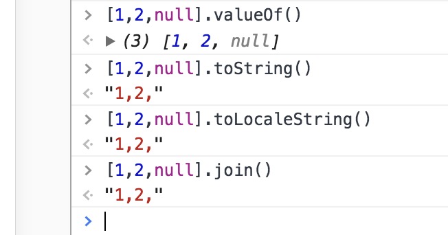 若数组某一项是undefined或者null,该值在toString(),toLocaleString(),join()返回结果中显示空字符,valueOf()还是原值,之前的知识点中String(undefined)和String(null)分别是'undefined'和'null'的,两者不存在toString()方法会报错的