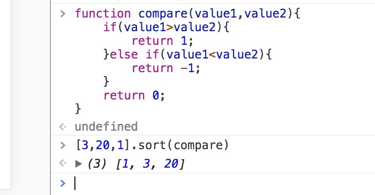 由于比较的是字符串,所以不够灵活,会出现20排在了3之前,所以sort()可以接受一个函数,返回值1表示value1排在value2后面,返回值-1表示value1排在value2前面,返回值0表示不动,所以完全可以自定义是从小到大排序还是从大到小排序