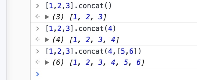 concat() => 基于当前数组生成副本,并在副本末尾追加数组项,参数可以是多项,非数组参数直接做为数组项追加,数组参数则里面每一项都做为数组项追加,参数为空则是原数组副本,不影响原数组