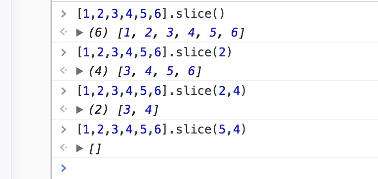 slice() => 基于当前数组截取数组项,生成新的数组,一个参数则从此参数做为起始索引至原数组末尾,两个参数则从第一个参数做为索引起始至第二个参数做为索引的前一项,参数为空则返回原数组副本,若第一个参数大于第二个参数则返回空数组,不影响原数组
