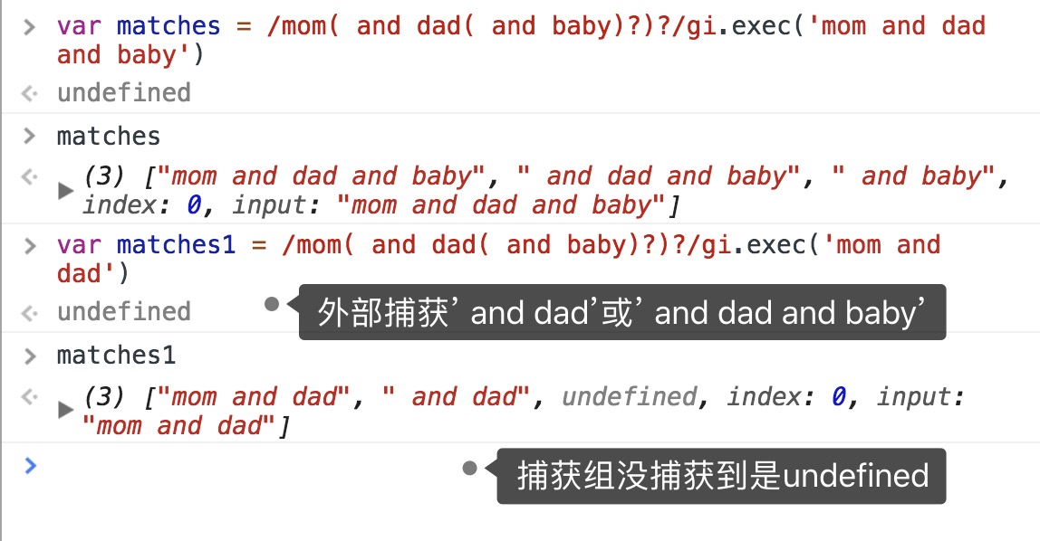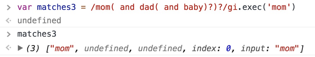 1⃣️返回包含匹配项信息的数组,第一项是匹配项,后面项是捕获组匹配项(若没有捕获组则数组只一项),是Array实例但是包含两个额外属性index(匹配项在字符串中的位置)input(应用正则的字符串)