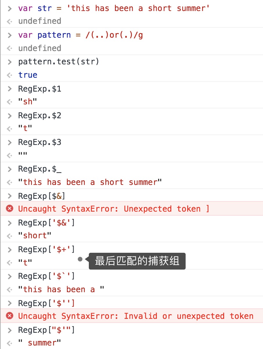 此外还存在9个用于存储捕获组的属性,访问方式依次是RegExp.$1、RegExp.$2…RegExp.$9,分别存储第一个、第二个…第九个捕获组