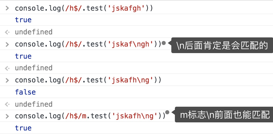 $ 匹配字符串的结束位置(写在单元项后),如果有m标志,也匹配\n或\r之前的位置,即折行后的一行字符串末尾也算是结束位置