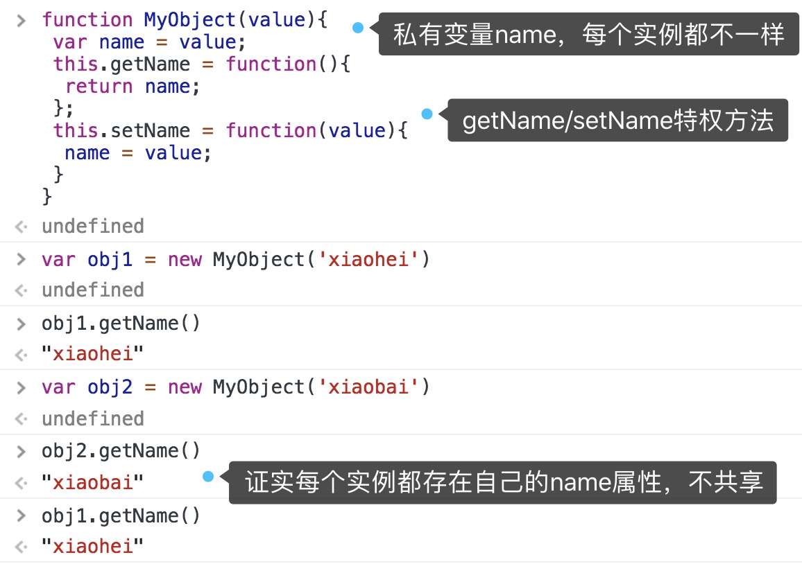 两种在对象上创建特权方法的方式: