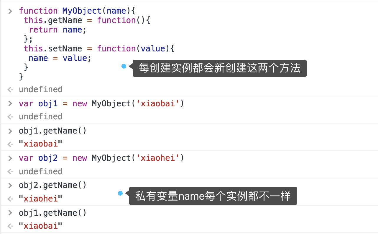 ⚠️构造函数的缺点就是每次创建实例都会重新创建一组相同的特权方法,并且私有变量的属性也不是共享的,每个实例有独立的一份私有变量