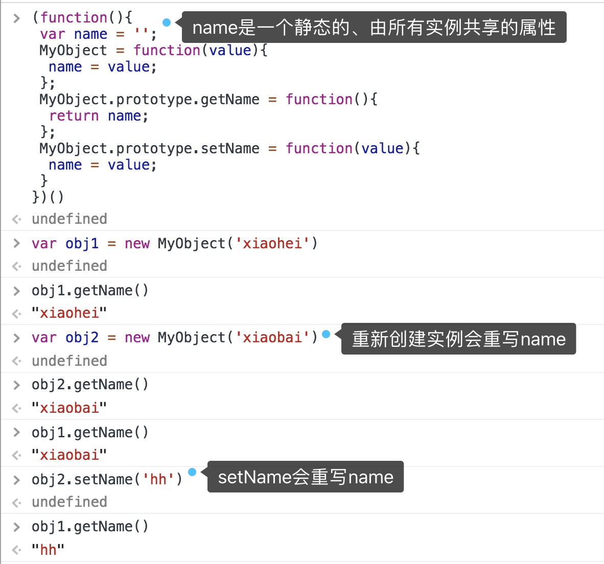 ⚠️静态私有变量的方式,使私有变量和方法被所有实例共享,特权方法是原型方法也被共享