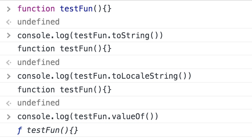 toString()和toLocaleString()返回函数代码,返回格式因浏览器而异valueOf()返回函数本身