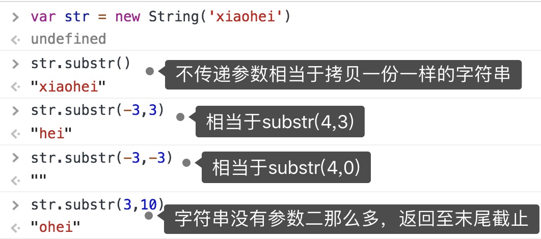 substr() 参数一是开始位置,参数二是返回字符个数,返回新的基本类型字符串,原字符串不变,参数是负数的情况参数一加length,参数二转换为0