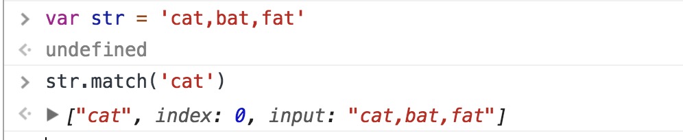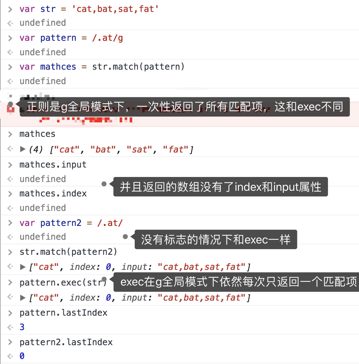 match() 参数是正则表达式或者字符串,本质上与RegExp调用exec()方法一样,返回数组,第一项是匹配项,之后都是捕获组匹配项,同时具备两个额外属性index input