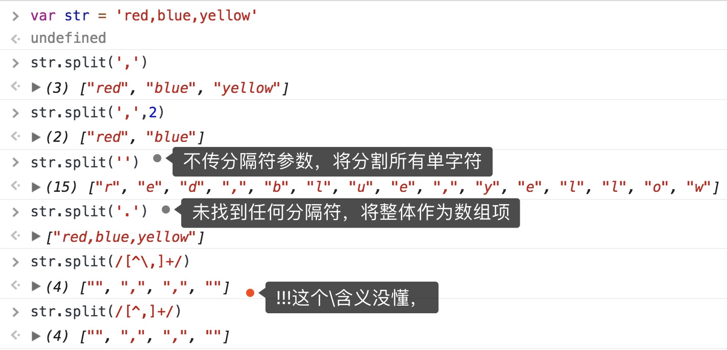 split() 以指定分隔符分割成多个子字符串作为数组项返回数组,参数一分隔符是字符串/正则,参数二(可选)指定数组大小