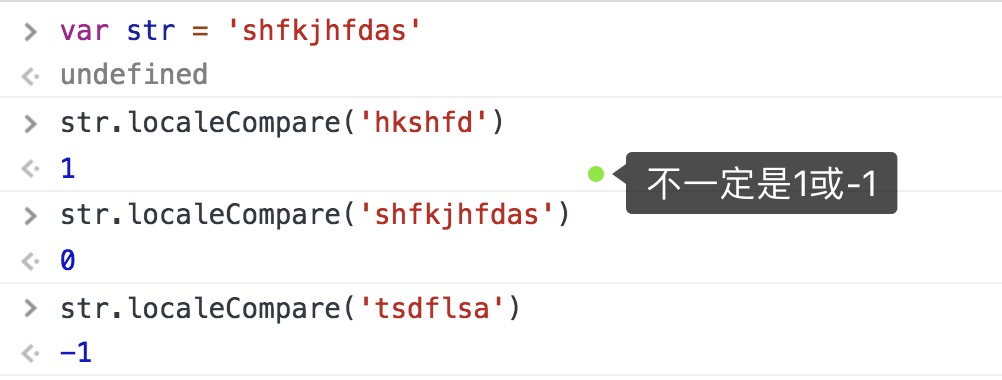 localeCompare() 与传参字符串比较字符编码位置,返回逻辑和数组的sort传参函数一样,排在参数后面说明大返回正数(未必是1),等于返回0,否则返回负数(未必是-1)