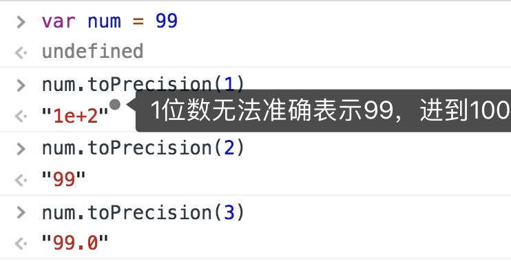 toPrecision() 按照指定的数值所有数字位数(不包含指数部分),更合理的调用toFixed或toExponential