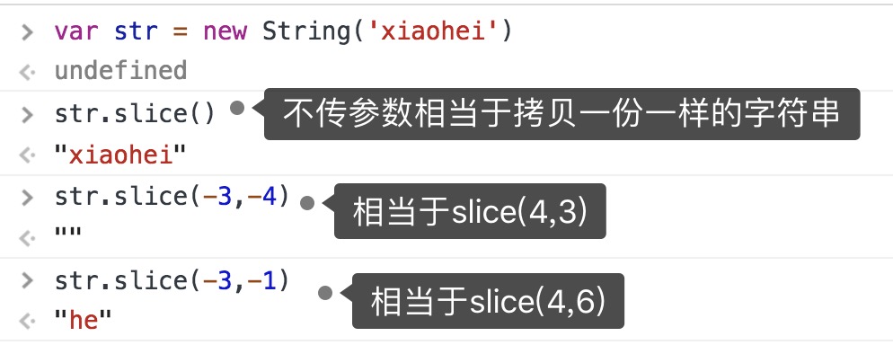 slice() 参数一是开始位置,参数二是结束位置的后面位置,返回新的基本类型字符串,原字符串不变,参数是负数的情况将负数加length,参数二大于参数一情况返回空字符串