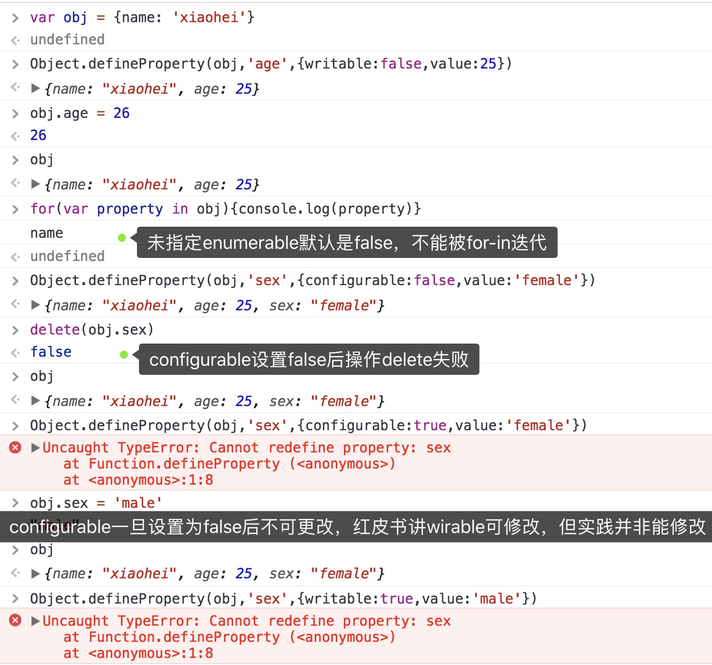 修改属性特性方法: Object.defineProperty(),参数一对象,参数二属性名,参数三特性对象(可设置一或多个值)