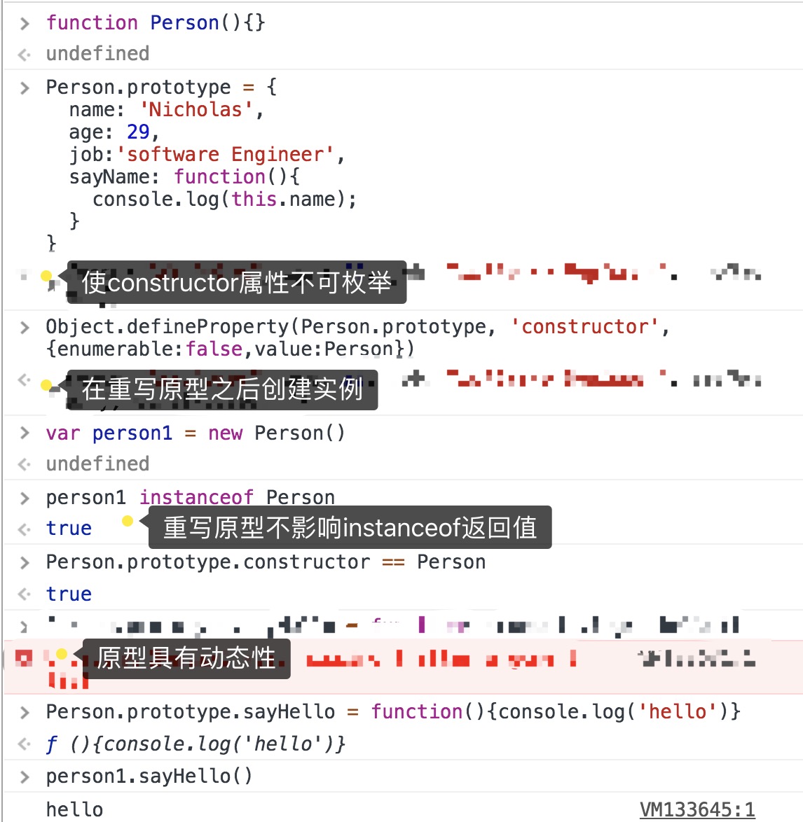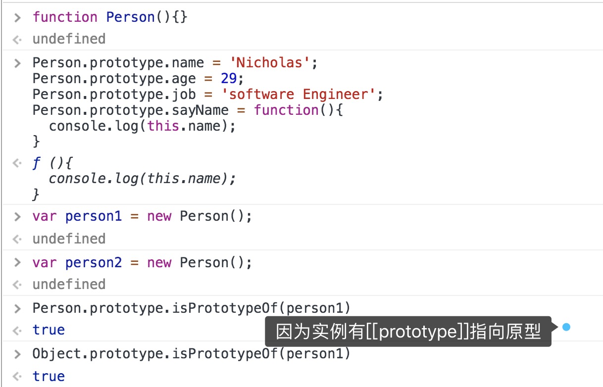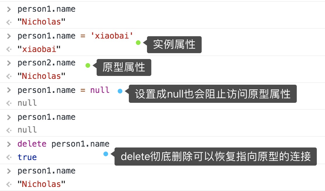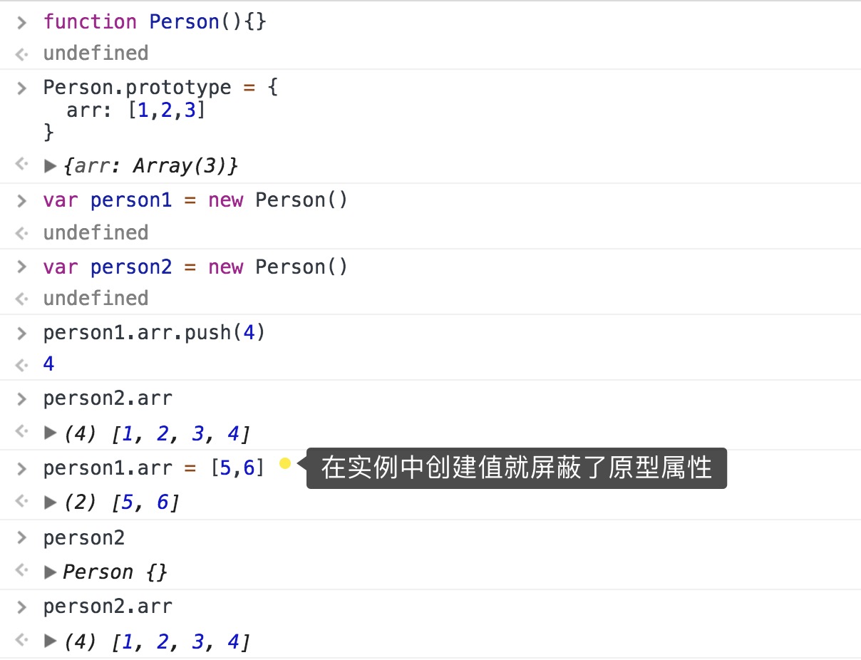 ⚠️可以通过实例访问到原型中的值,但不能通过实例更改原型中的值,即实例属性会屏蔽原型中的属性访问(这也是上面提到的访问属性过程中,第一次搜索实例本身就有则不再继续搜索)