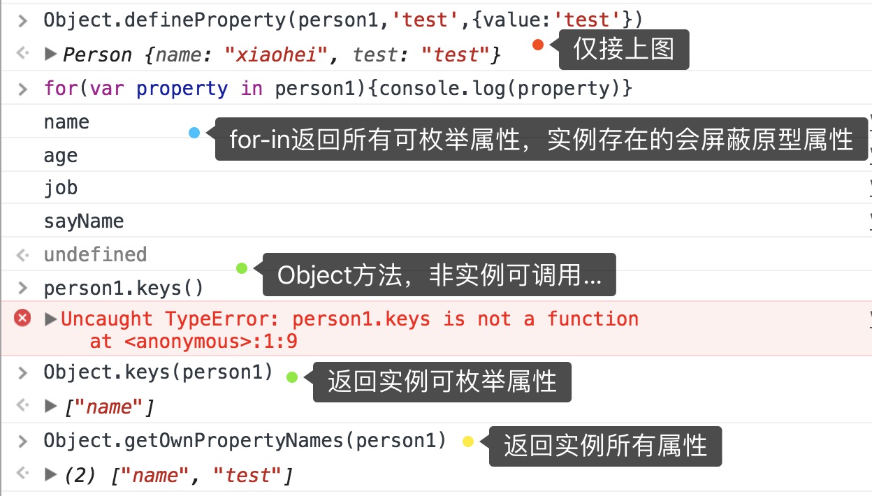 其他相关方法:Object.keys()返回实例的所有可枚举属性;Object.getOwnPropertyNames返回实例中所有属性数组(无论是否可枚举)