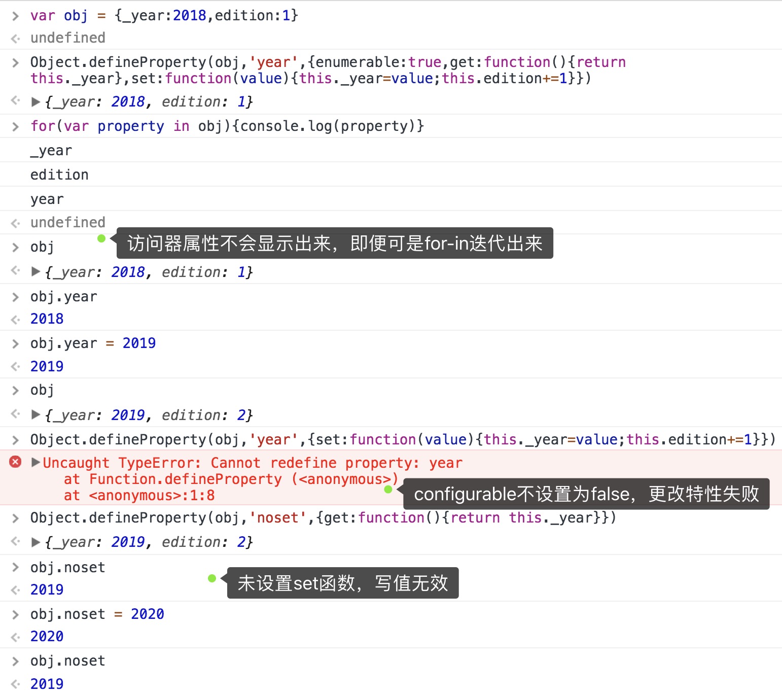 利用Object.defineProperty()设置特性,不设置get不能读,不设置set不能写: