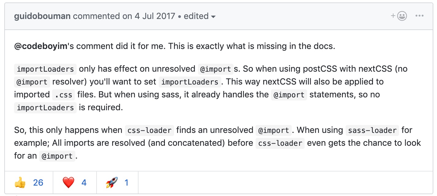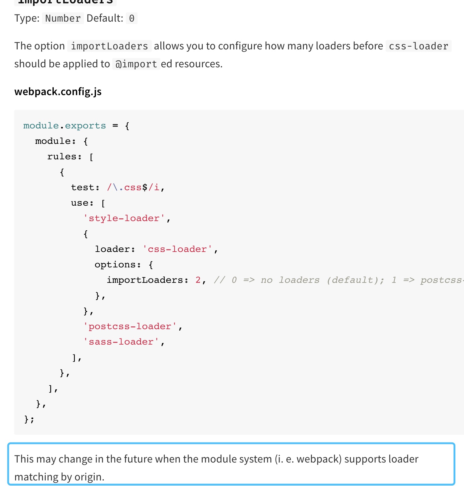 ⚠️2⃣️ modules模式下,光使用importLoaders不能抛出被引入的css文件中的局部class,但是composes可是正常使用,同时也能被postcss-loader处理,使用postcss-import没有以上问题,所以感觉postcss-import很有用。但是webpack文档中有特意描述说开启modules的时候需要加importLoaders,但是并没有描述清楚在解决什么问题,甚至importLoaders相关说明也不多,也有人提issue,我大概看了下貌似是解决上面的1⃣️问题,如图: